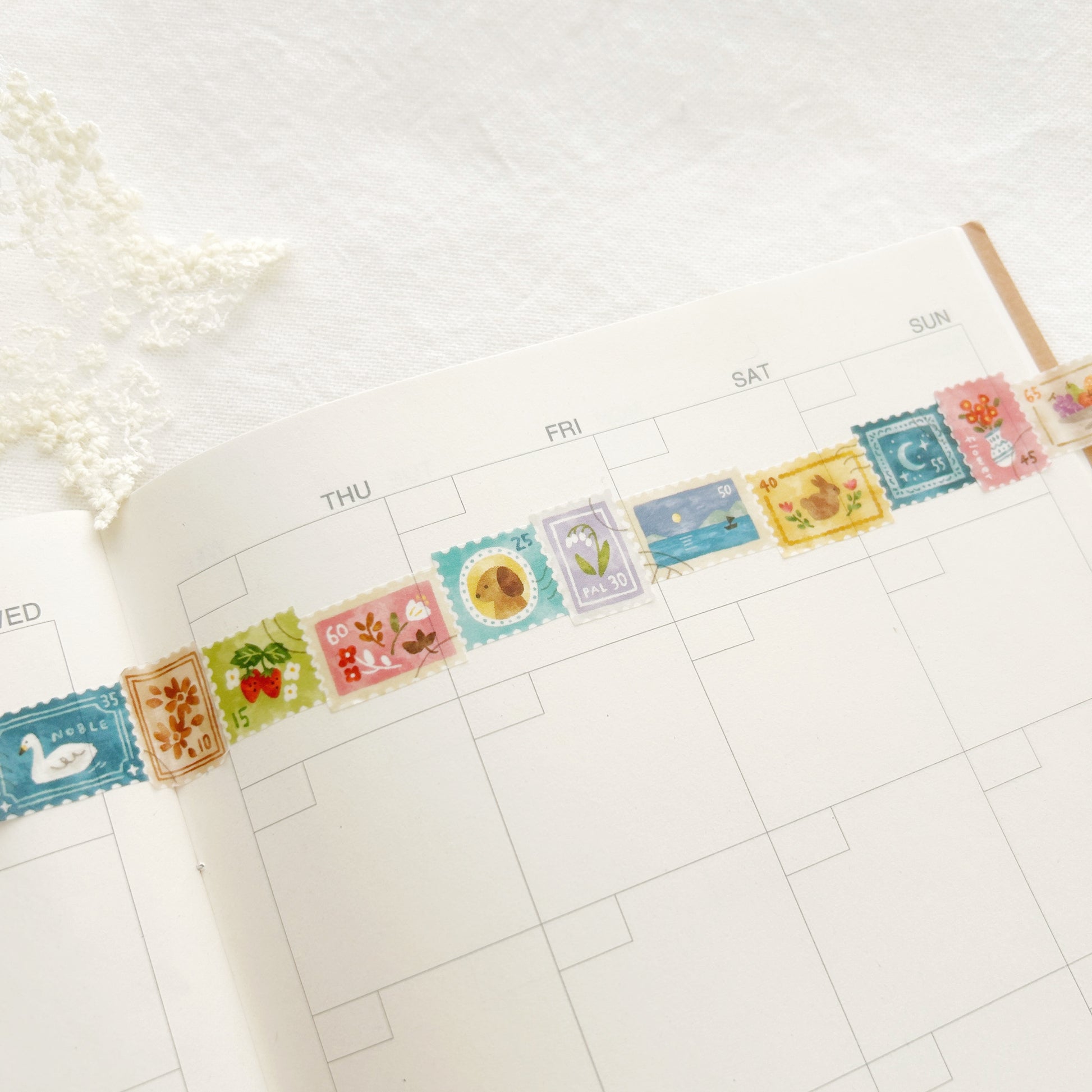 Mind Wave Cozy Washi Tape - Kitte brings a delightful postage theme to your creations, featuring charming mini stamp illustrations that feel like treasured snippets from far-off places. Each “stamp” on this tape has a warm, nostalgic touch, with soft colors and whimsical designs that add character and story to any page.