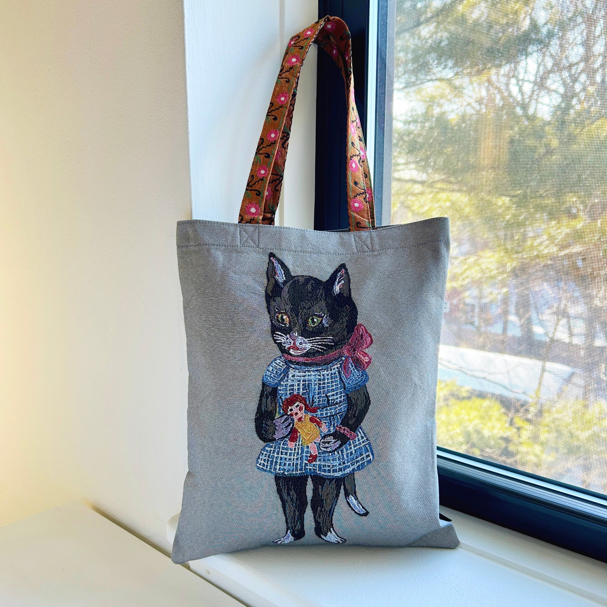 The use of fine threads and weaving techniques is used to create this weave tote bag, giving it a softer, warmer impression. Black Cat is an adorable feline dressed in a whimsical blue checked dress holding her favorite doll.